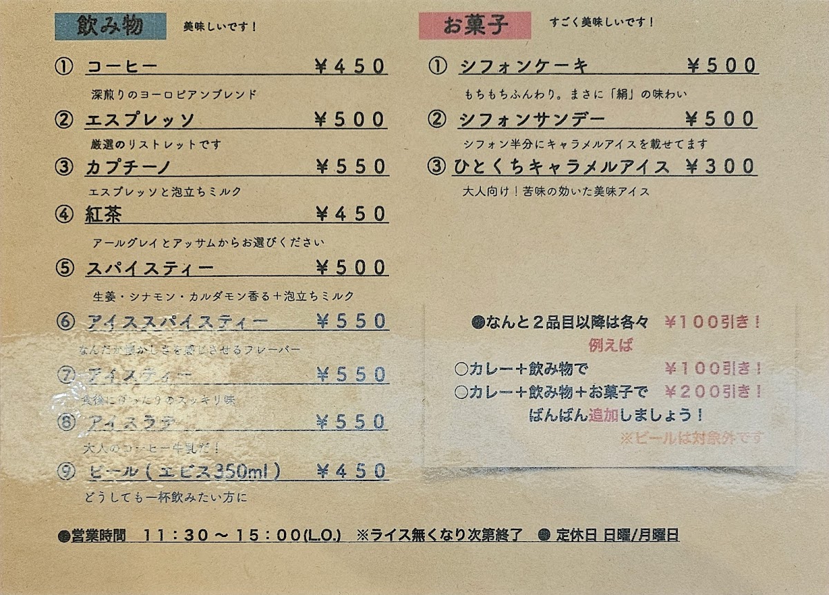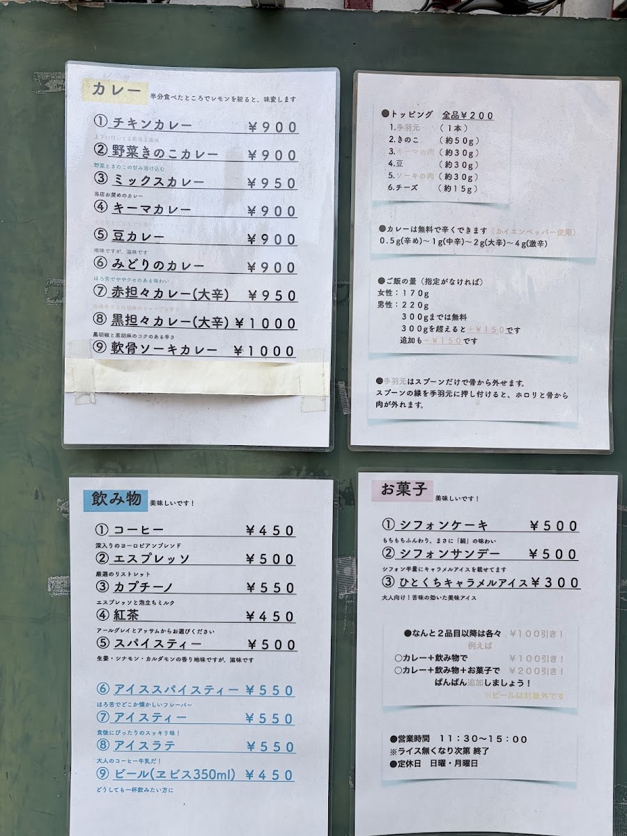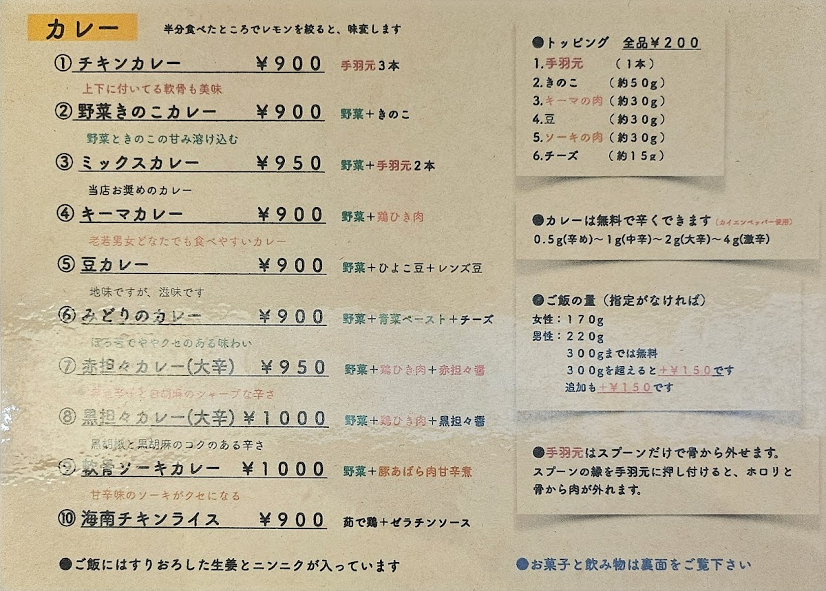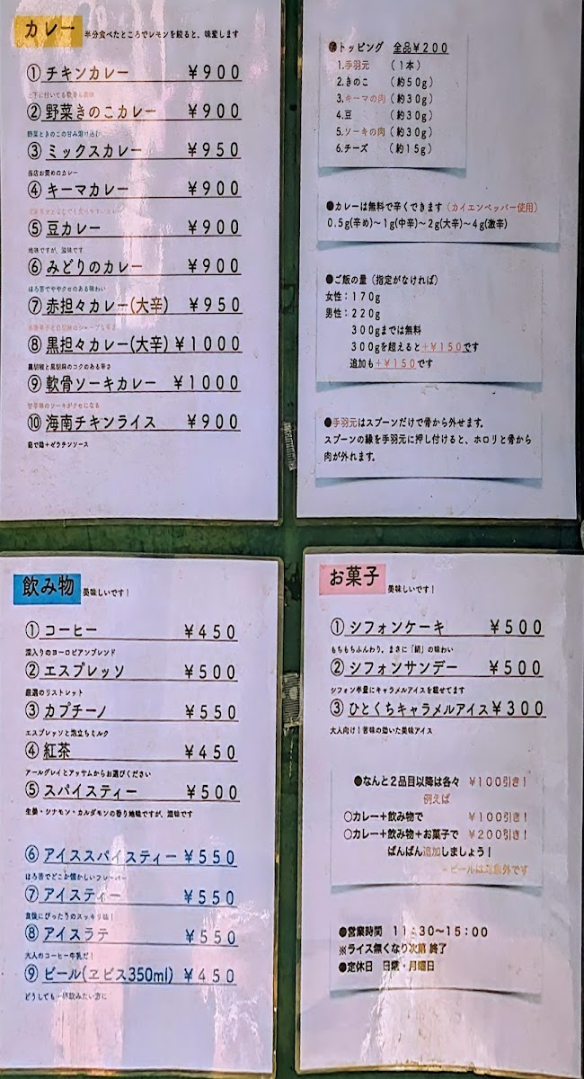 The menu at Kaeru Shokudo offers a delightful blend of comforting Japanese and international dishes, perfect for a variety of tastes. The ミックスカレー チーズトッピング (Mixed Curry with Cheese Topping) is a standout, combining rich, flavorful curries with a creamy, melted cheese topping that enhances the dish's heartiness. For those craving something sweet, the シフォンサンデー (Chiffon Sundae) presents a light and airy dessert that's both satisfying and refreshing. If you're in the mood for something with a bit more spice, the 黒坦々カレー (Black Tan Tan Curry) delivers a bold, flavorful kick with its complex spices and smooth texture. Pairing a dish with a hot beverage, the コーヒー (Coffee) is a well-balanced, aromatic option that complements the savory meals perfectly. For a taste of something lighter, the 海南チキンライス (Hainanese Chicken Rice) provides tender chicken with fragrant rice, offering a simple but delicious option. Those looking for a bite-sized treat can enjoy the ひとくちアイスクリーム (Bite-Sized Ice Cream), a fun and tasty way to finish off a meal. Finally, the シフォン ケーキ 二 種 盛り (Two Types of Chiffon Cake) offers a selection of fluffy cakes, perfect for a satisfying yet delicate dessert experience. Kaeru Shokudo's menu is a balanced fusion of savory and sweet, with something to satisfy any craving.