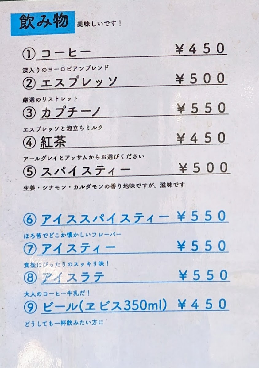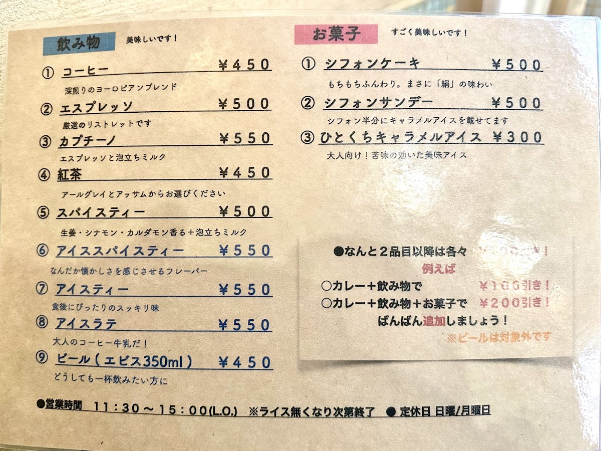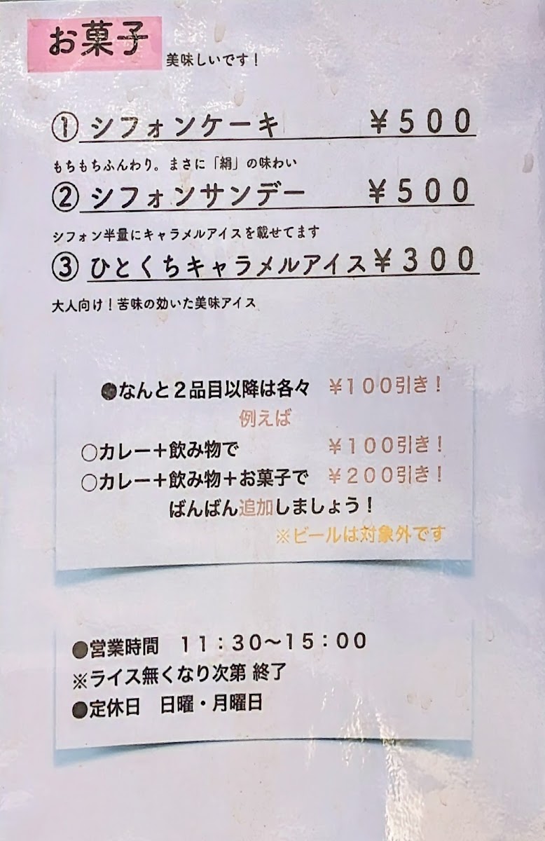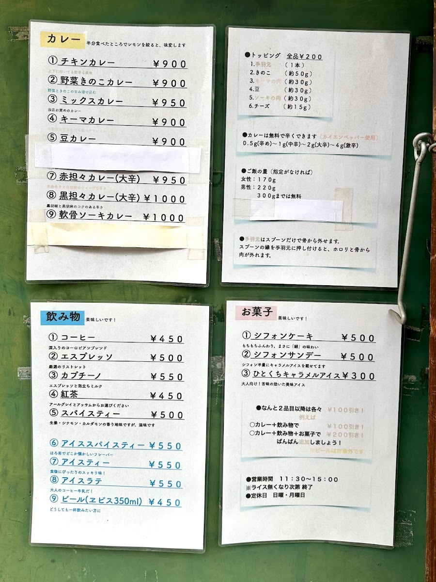 The menu at Kaeru Shokudo offers a delightful blend of comforting Japanese and international dishes, perfect for a variety of tastes. The ミックスカレー チーズトッピング (Mixed Curry with Cheese Topping) is a standout, combining rich, flavorful curries with a creamy, melted cheese topping that enhances the dish's heartiness. For those craving something sweet, the シフォンサンデー (Chiffon Sundae) presents a light and airy dessert that's both satisfying and refreshing. If you're in the mood for something with a bit more spice, the 黒坦々カレー (Black Tan Tan Curry) delivers a bold, flavorful kick with its complex spices and smooth texture. Pairing a dish with a hot beverage, the コーヒー (Coffee) is a well-balanced, aromatic option that complements the savory meals perfectly. For a taste of something lighter, the 海南チキンライス (Hainanese Chicken Rice) provides tender chicken with fragrant rice, offering a simple but delicious option. Those looking for a bite-sized treat can enjoy the ひとくちアイスクリーム (Bite-Sized Ice Cream), a fun and tasty way to finish off a meal. Finally, the シフォン ケーキ 二 種 盛り (Two Types of Chiffon Cake) offers a selection of fluffy cakes, perfect for a satisfying yet delicate dessert experience. Kaeru Shokudo's menu is a balanced fusion of savory and sweet, with something to satisfy any craving.